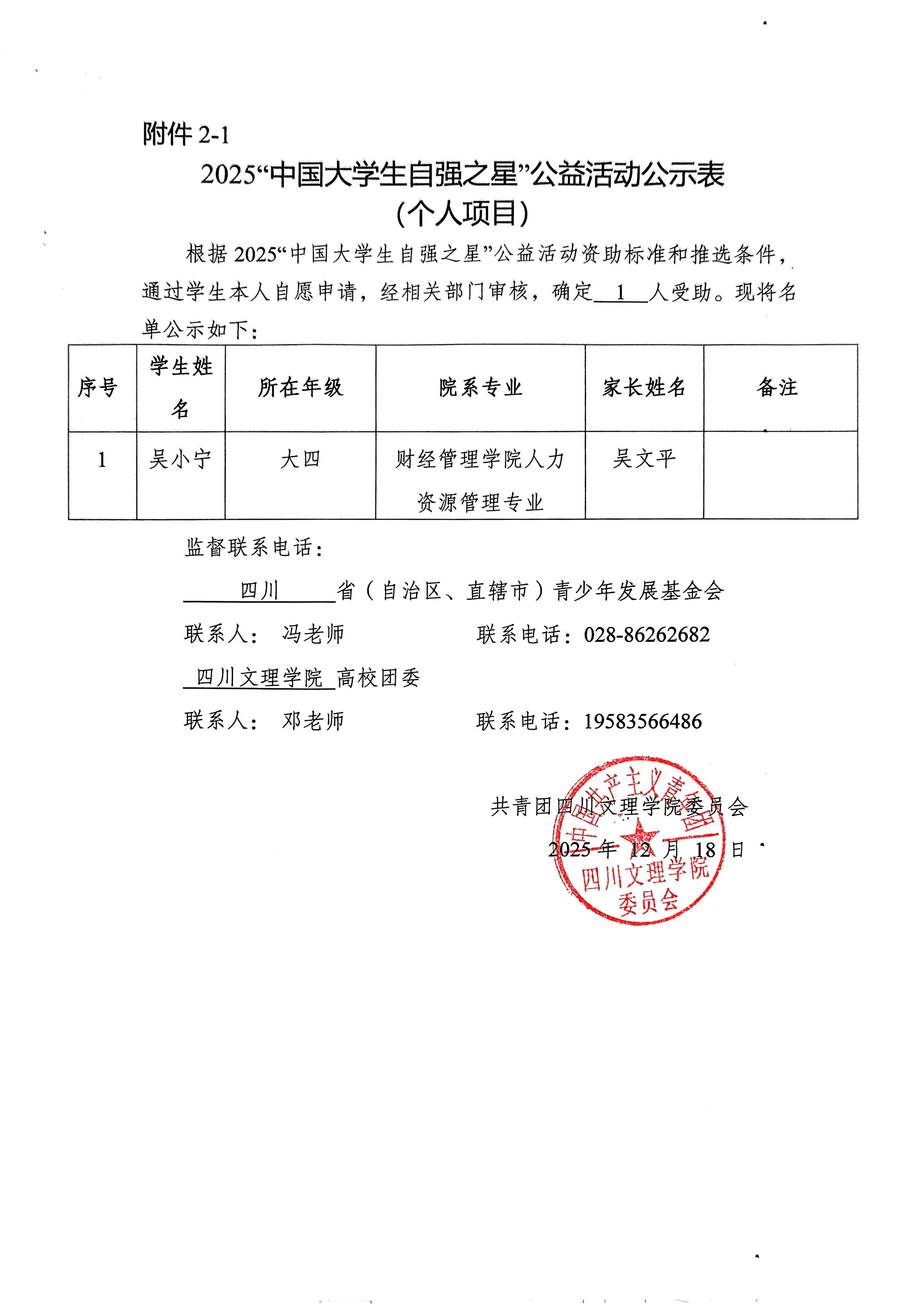 2025“中国大学生自强之星”公益活动公示表